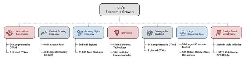 India is one of the fastest-growing markets amongst the emerging economies with an average annual GDP growth of 6.5%. With a large population, comprehensive tax structure, low operational costs, and robust trade networks, India offers immense opportunities for foreign entities to set up their business. Also, with geopolitical stability and strong ties with the US, Europe, ASEAN, and the Middle East, India is a strategic choice for global investors looking to enter the Asian market.